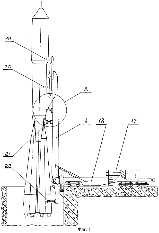 После укладки РН 4 в МИКе на опорные ложементы 19, 20, 21, 22 грузоподъемной стрелы 1 ТУА для доставки ее на стартовую позицию и установки на ПУ с площадок 17 производится присоединение концов силовых тяг 2 к узлам крепления 3 на обоих бортах РН 4. По окончании подъезда ТУА к ПУ РН 4 и установки ТУА в надлежащее для подъема грузоподъемной стрелы 1 положение производят подъем грузоподъемной стрелы 1 гидравлическими средствами ТУА. При этом по мере подъема грузоподъемной стрелы 1 силовые тяги 2 начинают воспринимать вначале часть веса РН 4, а при угле подъема грузоподъемной стрелы 1, равном 90°, – весь вес РН 4, который равномерно распределяется по обоим силовым тягам 2, т.к. нагрузка от силовых тяг 2 передается через рычаги 5 на тяги 9, а последние – на балансиры 10, связанные между собой поперечной тягой 15 и присоединенные к грузоподъемной стреле 1 осью 12, с помощью которой нагрузка от балансиров 10 передается через втулки 13 на боковых листах 14 грузоподъемной стрелы 1 на грузоподъемную стрелу 1 в целом. При неравномерном нагружени силовых тяг 2 вследствие, например, смещения центра тяжести РН 4 относительно ее продольной оси более нагруженная силовая тяга 2 с одного борта РН 4 передает через один из рычагов 5 и тягу 9 большую нагрузку на один из балансиров 10, чем менее нагруженная силовая тяга 2 (с другого борта РН 4) на другой балансир. Эта большая нагрузка через тягу 15 передается на другой, менее нагруженный балансир и, увеличивая в нем нагрузку, уравнивает таким образом нагрузки в обоих силовых тягах 2. При этом величина этих нагрузок, определяемая только весом РН 4 и углом наклона силовых тяг 2 к вертикали, подобрана за счет величины угла силовых тяг 2 к вертикали таким образом, что горизонтальные составляющие от веса РН 4 при ее вертикальном положении, приложенные в узлах крепления 3 на обоих бортах РН 4, прижимают ее к опорным ложементам 19, 20, 22 на грузоподъемной стреле 1 с суммарной силой, превышающей по величине расчетную ветровую нагрузку на РН 4, приложенную со стороны грузоподъемной стрелы 1 ТУА, что делает положение РН 4 на грузоподъемной стреле 1 ТУА стабильно неподвижным без использования ветрового захвата на ее конце, а сам ТУА за счет отказа от ветрового захвата более надежным в эксплуатации и более простым по конструкции.