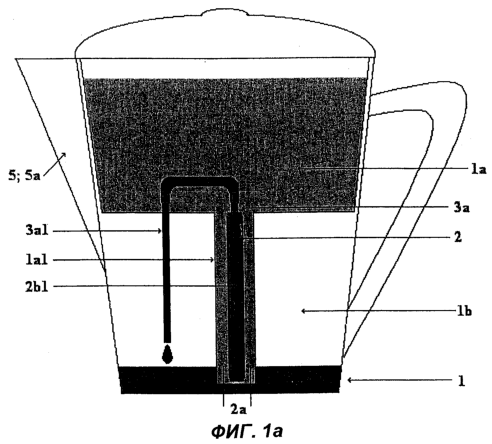 Для использования отфильтрованной воды аппарат включает в себя также выпускное устройство 5, например, такое как сливной носик 5а или клапан 5b. Возможные варианты указанных устройств показаны, соответственно, на фиг.1а, 1b и 2а, 2b, 3а, 3b. В данных вариантах осуществления изобретения “вентиляцию” вторичного объема 1b можно проводить посредством, например, встроенного воздушного патрубка, связывающего воздушные пространства первичного и вторичного объемов, или, например, с помощью полностью автономных вентилирующих устройств.