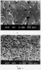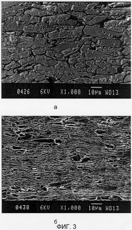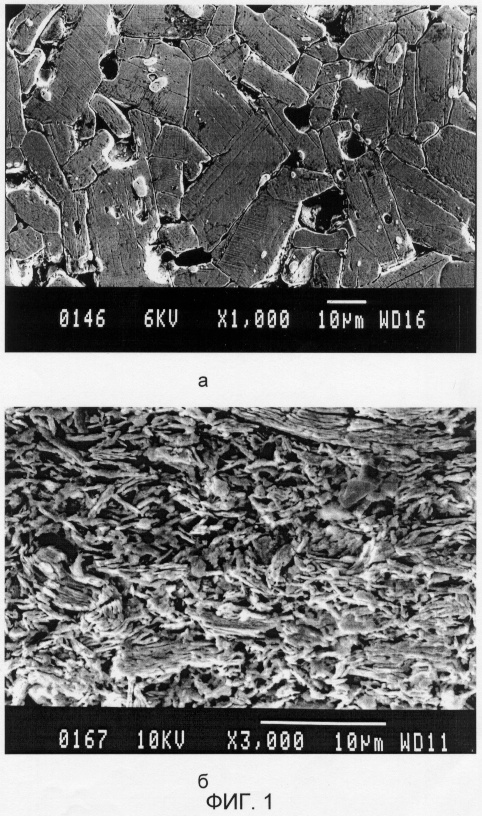 Необходимо получить изделие из керамики Bi2212 в виде стакана толщиной 0,5 мм, внешним диаметром 20 мм и длиной 30 мм, в котором сверхпроводящие токи текут по замкнутым траекториям на поверхности. Для обеспечения таких направлений тока нужна комбинированная текстура – на цилиндрической поверхности базисные плоскости должны ориентироваться перпендикулярно радиусам стакана, а на дне стакана – перпендикулярно оси стакана. Для получения изделия с такой текстурой деформацию осуществляют посредством выдавливания. Берут исходную спеченную заготовку в форме цилиндра диаметром 17 мм, высотой 6 мм и средним размером зерен около 0,5 мкм (фиг.1б). Заготовку помещают в оболочку из сплава серебро-магний и проводят выдавливание стакана с механическим противодавлением при температуре 820°С. При этом выдавливающий пуансон осуществляет поступательно – вращательное перемещение, что позволяет существенно уменьшить усилие деформации и увеличить степень деформации. Угол поворота пуансона 90°. Скорость деформации составляет 10-4 с-1 После окончания выдавливания осуществляют термообработку при 840°С в течение 30 час. Далее проводят механическую обработку, в процессе которой возможно отрезание дна стакана. Микроструктура среза, проходящего по оси прутка, аналогична представленной на фиг.3б. Полученные стакан или труба могут быть использованы в качестве экрана, резонатора.