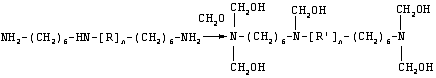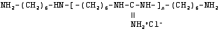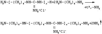 Изобретение относится к способам получения дезинфицирующих средств на основе производных полигексаметиленгуанидина, которые используют в медицине и ветеринарии, при очистке природных и сточных вод, в процессах выделки кожи и меха, а также в промышленных отраслях и бытовых условиях, где требуются биоцидные препараты. Известен способ получения дезинфицирующего средства в виде производного полигексаметиленгуанидина, представляющего собой хлорид полигексаметиленгуанидина, термической поликонденсацией в расплаве гексаметилендиамина и гуанидингидрохлорида, включающий смешение твердых мономеров гуанидингидрохлорида и гексаметилендиамина, взятых при молярном соотношении 1:1, и постепенное в течение 11 часов повышение температуры реакционной смеси от 120 до 180°С. (П.А. Гембицкий и др. Журнал прикладной химии №48, 1975 г., стр.1833). Недостатком полимерного продукта, полученного известным способом, является низкая молекулярная масса и реакционная способность функциональных концевых групп макромолекулы. Наиболее близким по технической сущности и достигаемому результату является способ (прототип) получения дезинфицирующего средства в виде производного полигексаметиленгуанидина, представляющего собой хлорид полигексаметиленгуанидина, поликонденсацией в расплаве гуанидингидрохлорида и гексаметилендиамина (Патент РФ №1616898). Гуанидингидрохлорид синтезируют предварительно путем сплавления дициандиамида и хлористого аммония при температуре 180°С, а расплав гексаметилендиамина с температурой около 50°С в количестве, обеспечивающем его молярное отношение к гуанидингидрохлориду 1.0-0.85, равномерно при постоянном перемешивании вводят в расплав гуанидингидрохлорида в течение 2.5 часов. Одновременно с введением гексаметилендиамина смесь нагревают до 180°С. По окончании подачи гексаметилендиамина осуществляют нагрев смеси до температуры 240°С и термостатируют ее при этой температуре в течение 5 часов. Недостатком полимерного продукта, полученного известным способом, является большое содержание нерастворимой в воде фракции, пониженная бактерицидная активность и слабая реакционная способность функциональных концевых групп макромолекулы. Технический результат, достигаемый предлагаемым изобретением, заключается в снижении выхода нерастворимой в воде фракции целевого продукта, повышение бактерицидной активности макромолекулы и реакционной способности ее функциональных концевых групп. Сущность изобретения заключается в способе получения дезинфицирующего средства в виде производного полигексаметиленгуанидина, включающем термическую поликонденсацию введением гексаметилендиамина в расплав гуанидингидрохлорида, нагревание реакционной смеси и ее термостатирование при повышенной температуре и перемешивании, получения целевого продукта, отличающемся тем, что поликонденсацию проводят в две стадии. На первой стадии в расплав гуанидингидрохлорида вводят гексаметилендиамин до молярного соотношения 1:1 и термостатируют реакционную смесь при температуре поликонденсации до прекращения выделения аммиака. После исчерпания в процессе термостатирования молярного соотношения мономеров гуанидингидрохлорида и гексаметилендиамина 1:1 и роста полимерной цепи по принципу многократного удвоения на этой стадии поликонденса