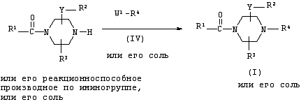 1. Производное ароилпиперазина формулы I в котором Y представляет низший алкилен; R1 представляет фенил, содержащий 1 или 2 заместителя, выбранных из группы, состоящей из тригалоген(низшего)алкила, галогена, низшего алкиламино, ди(низший)алкиламино и нитро; R2 представляет фенил или индолил, каждый из которых содержит 1 или 2 заместителя, выбранных из группы, состоящей из низшего алкила, тригалоген(низшего)алкила, низшего алкилендиокси, гидрокси, гидрокси(низшего)алкила, низшего алкокси, низшего алкиламино и ди(низший)алкиламино; R3 представляет водород и R4 представляет морфолинил(низший)алкил, содержащий 1 или 2 заместителя, выбранных из группы, состоящей из этила, гидрокси(низшего)алкила, галоген(низшего)алкила и низшего алкокси(низшего)алкила; или морфолинил(низший)алкинил, который может содержать 1 или 2 заместителя, выбранных из группы, состоящей из этила, пропила, изопропила, изобутила, спироцикло(низшего)алкила, низшего алкокси(низшего)алкила, гидрокси(низшего)алкила, карбокси(низшего)алкила, ди(низший алкил)карбамоила, низшего алкоксикарбонила и галоген(низшего)алкила. 2. Соединение по п.1 выбранное из группы, состоящей из (1) (2R)-1-[3,5-бис(трифторметил)бензоил]-4-[4-((3S)-3-этилморфолино)-2-бутинил]-2-[(1Н)-индол-3-ил)метил]пиперазина, (2) (2R)-1-[3,5-бис(трифторметил)бензоил]-2-(3,4-диметилбензил)-4-[2-((2S)-2-метоксиметилморфолино)этил]пиперазина, (3) (2R)-1-[3,5-бис(трифторметил)бензоил]-2-(3,4-диметилбензил)-4-[2-((3R)-3-метоксиметилморфолино)этил]пиперазина, (4) (2R)-1-[3,5-бис(трифторметил)бензоил]-2-(3,4-диметилбензил)-4-[2-((2R)-2-метоксиметилморфолино)этил]пиперазина, (5) (2R)-1-[3,5-бис(трифторметил)бензоил]-2-[(1Н)-индол-3-ил)метил]-4-[2-((2S)-2-метоксиметилморфолино)этил]пиперазина и (6) (2R)-1-[3,5-бис(трифторметил)бензоил]-4-[2-((3R)-3-этилморфолино)этил]-2-[(1Н)-индол-3-ил)метил]пиперазина, или его фармацевтически приемлемая соль. 3. Соединение по п.1 в качестве лечебного средства для лечения или предотвращения тахикинин-опосредованных заболеваний. 4. Соединение по п.1 в качестве антагониста тахикинина. 5. Соединения по п.1 для производства лечебного средства для лечения или предотвращения тахикинин-опосредованных заболеваний. 6. Способ получения соединения по п.1 или его соли, включающий: (1) взаимодействие соединения формулы (II) в которой каждый из R1, R2, R3 и Y имеет значения, указанные в п.1, или его соли с соединением формулы (IV) W1-R4 (IV) в которой R4 имеет значения, указанные в п.1, и W1 представляет отщепляющуюся группу, или его солью с образованием соединения формулы (I) в которой каждый из R1, R2, R3, R4 и Y имеет значения, указанные в п.1, или его соли. 7. Фармацевтическая композиция, обладающая активностью агониста тахикинина, содержащая в качестве активного ингредиента соединение по п.1 или его фармацевтически приемлемую соль в смеси с фармацевтически приемлемыми носителями. 8. Способ лечения или предотвращения тахикинин-опосредованных заболеваний, включающий введение в организм человека или животного эффективного количества соединения по п.1 или его фармацевтически приемлемой соли.