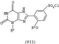 (где R2 и R3 имеют указанные выше значения) взаимодействием с хлорсульфоновой кислотой (предпочтительно, в избытке), предпочтительно, в атмосфере азота и при температуре от -50°с до 100°С и с использованием в качестве растворителя той же самой хлорсульфоновой кислоты. По этому способу получают сульфонилхлорид формулы (VII):