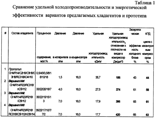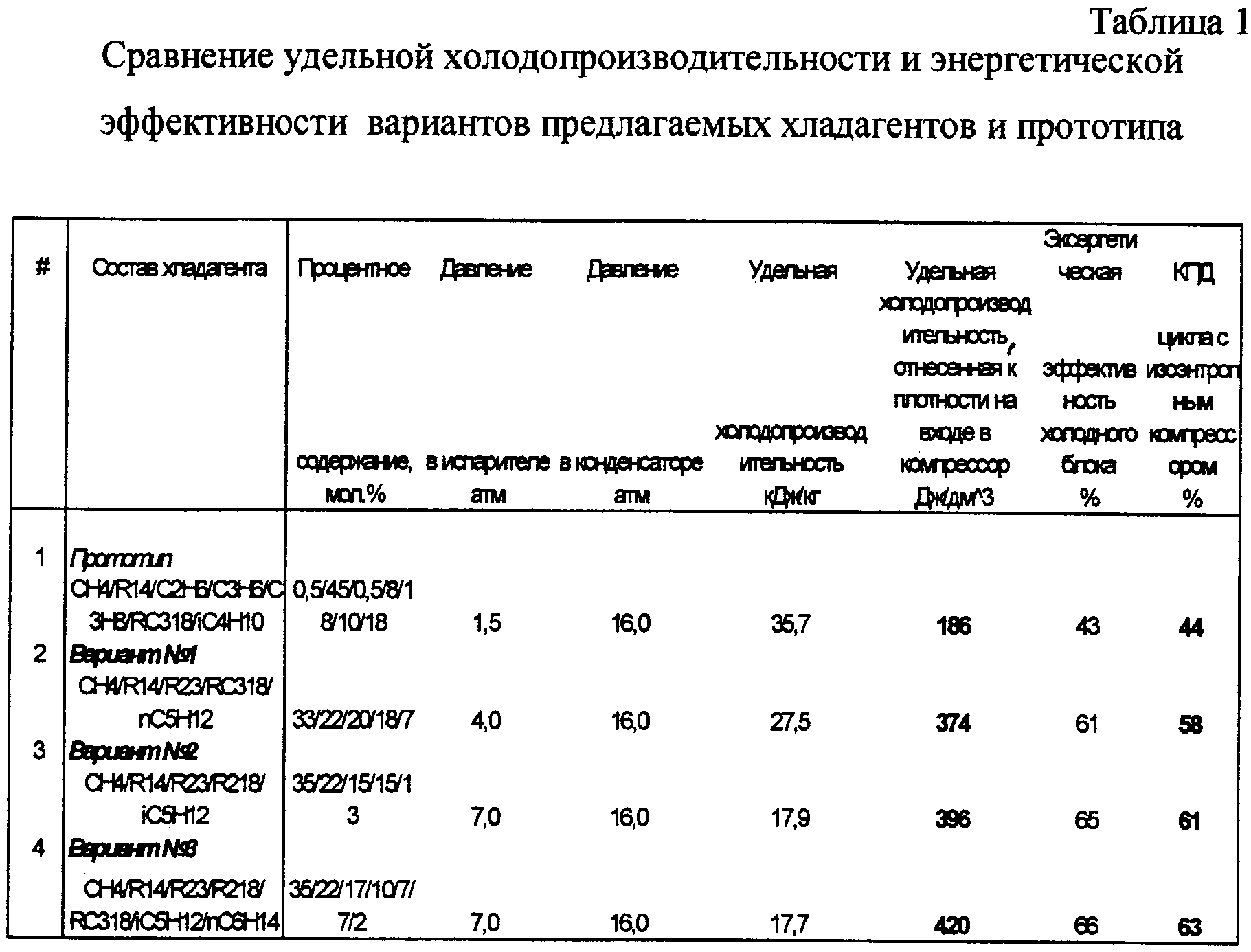 В таблице 1 для сравнения приведены значения удельной холодопроизводительности, эксергетического КПД блока охлаждения, давлений в конденсаторе и испарителе одноконтурной холодильной установки, работающей на хладагенте-прототипе, и новых, предлагаемых нами хладагентах (варианты 1, 2, 3) в условиях, характерных для низкотемпературных рефрижераторов: температура охлаждения -100°С, температура окружающей среды + 30°С, минимальная разность температур в противоточном теплообменнике =3°С.