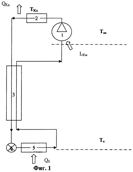 Принцип работы одноконтурной холодильной системы с серийным одноступенчатым компрессором и расчет эффективности работы такой системы иллюстрируются прилагаемыми фиг.1 и фиг.2.