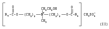 (1) Фосфонатный связывающий компонент фирмы Monsanto Chemical Company. Воду нагревают до 60°С и затем в горячей воде растворяют краситель, связывающее вещество Деквест и неионогенный эмульгатор для получения первой порции. Во втором сосуде плавят и смешивают мешалкой при 60°С сложный умягчитель и глицеринмоностеарат. Получаемую гомогенную смесь затем диспергируют при перемешивании с описанной выше первой порцией. Перемешивание осуществляют в течение примерно 10 мин до получения однородной эмульсии. Получающейся эмульсии позволяют охладиться до 25°С при перемешивании. К охлажденной эмульсии при перемешивании добавляют ароматизатор. Добавлением хлорида кальция регулируют вязкость умягчителя в диапазоне от 100 до 200 сП. Пример 2 Проводят следующие эксперименты по старению для иллюстрации влияния на стабильность продукта применения эмульгатора по изобретению в сравнении с использованием известных эмульгаторов на основе четвертичных аммониевых умягчителей. Готовят три умягчающих композиции, как описано в Примере 1, на основе сложного диэфира жирной кислоты и четвертичного аммониевого основания и ГМС, обозначаемые композициями А, В и С.