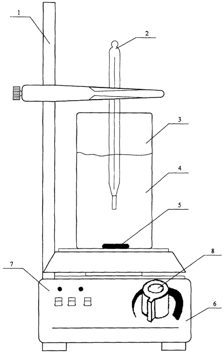 Для выщелачивания методом кольца и конуса отбиралась проба массой 50 г каждая. Выщелачивание проводили в лабораторных условиях при атмосферном давлении и механическом перемешивании раствора на установке, изображенной на чертеже. На штативе 1 закреплен термометр 2, который опущен в стакан 3, ниже уровня раствора серной кислоты 4. Поддержание твердых частиц выщелачиваемого материала во взвешенном состоянии осуществляли перемешивателем 5, помещая в стакан магнитную мешалку 6 типа ММ-6. Необходимая температура раствора поддерживалась включением регулятора температуры 7, а скорость вращения мешалки регулировали регулятором скорости вращения 8.