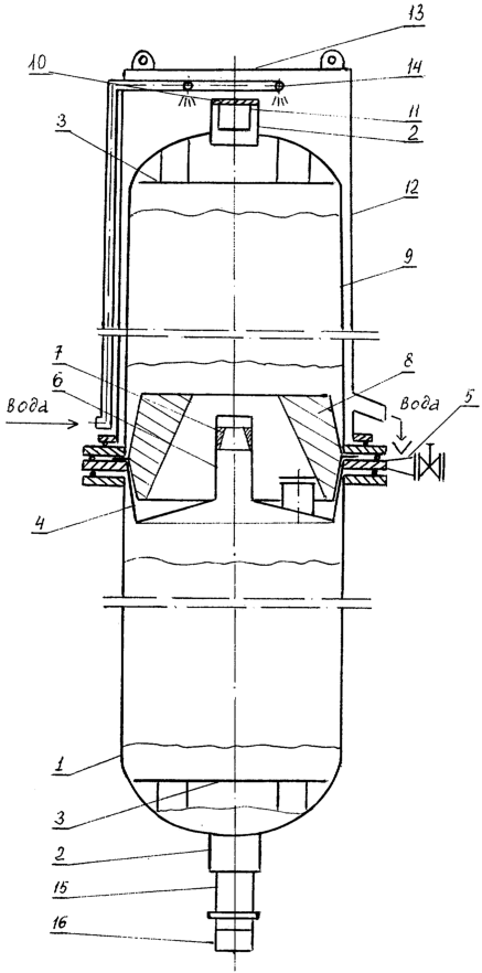 Аппарат для вакуумной сепарации губчатого титана изображен на чертеже. Аппарат состоит из реторты-реактора 1 с донным патрубком 2, ложным дном 3, крышкой 4 с боковым вакуумным отводом 5 во фланце крышки 4, центральным патрубком 6 с жестко прикрепленным внутри него насадком 7 в форме усеченного конуса, в котором соотношение диаметров выходного отверстия к входному составляет 0,4-0,6, а соотношение высоты патрубка 6 с насадком 7 к высоте крышки 4 составляет 1,0-1,5. Сверху крышки 4 установлен тепловой экран 8 и реторта-конденсатор 9 с ложным дном 3 и донным патрубком 2, к которому жестко прикреплена (приварена) заглушка 10 с металлической П-образной обечайкой 11. На реторту-конденсатор 9 установлен кессон 12, герметично закрытый крышкой 13 (например, приваренной), под которой установлен распределитель воды 14. К донному патрубку 2 реторты-реактора 1 приварено сливное устройство 15 с заглушкой 16.