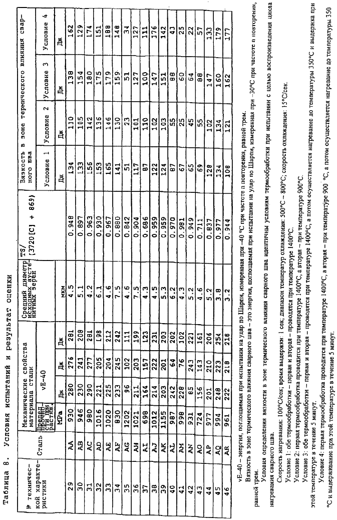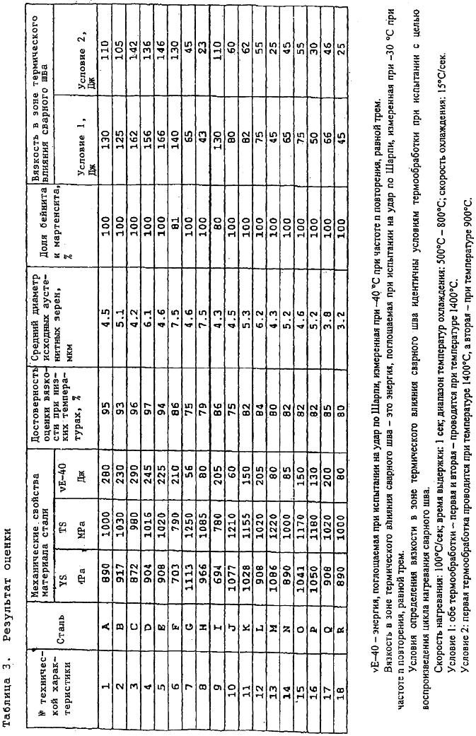В результате подробного исследования проблемы дисперсии вязкости при низких температурах выяснилось, что энергия, поглощаемая при испытании на удар по Шарпи, с вероятностью 20 процентов составляла менее 200 Дж, когда испытание на удар по Шарпи проводили при температуре -40°С при нарастании числа n, а кроме того, энергия, поглощаемая при испытании на удар по Шарпи некоторыми образцами, не превышала 100 Дж, причем на поверхностях разрушения образцов наблюдались грани хрупкого разрушения, когда испытание на удар по Шарпи проводилось в диапазоне температур от -60°С до температуры, не превышавшей -40°С.