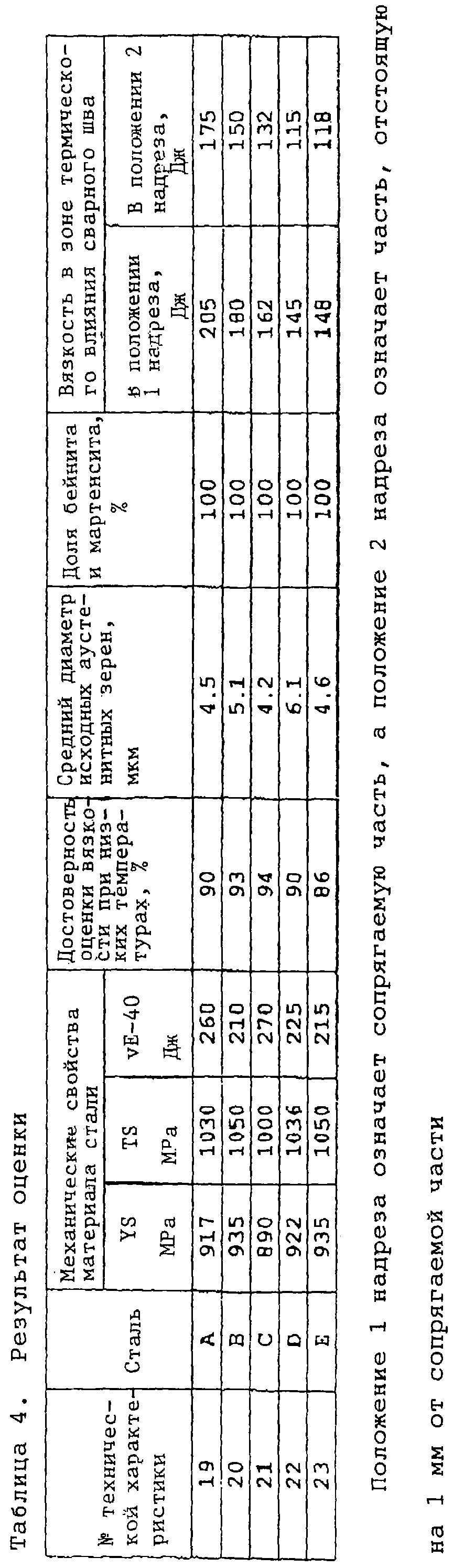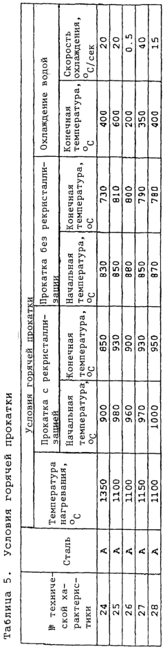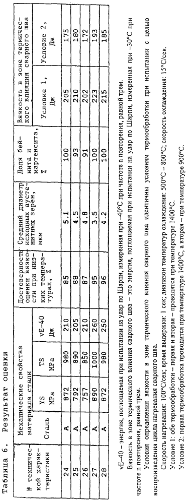 Для исследования механических свойств основных сталей этих стальных труб, как и в примере 4, проводили испытание на растяжение по всей толщине в соответствии с методикой АНИ и испытание на удар по Шарпи при температуре -40°С, пользуясь образцами, длина которых была ориентирована в направлении С. Энергию, поглощаемую при испытании на удар по Шарпи, получали, измеряя ее с частотой n повторения, равной трем, и находя среднее значение трех измеренных величин. Далее получали вязкость в зоне термического влияния сварного шва, подвергая испытуемый образец, имеющий V-образный надрез в пересечении или в части, отстоящей на 1 мм от пересечения, еще одному испытанию на удар по Шарпи при температуре -30°С, и находя среднее значение трех получаемых величин.