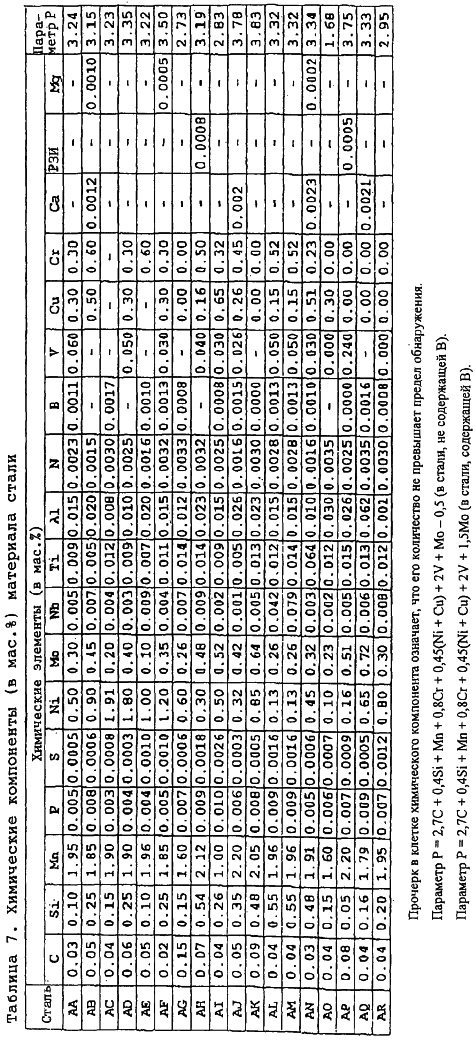 Стальные листы, содержащие химические компоненты сталей АА-АЕ, приведенные в таблице 7, получали в тех же условиях, что и в примере 4, а после этого стальные листы подвергали формованию с получением труб на операциях UO и подвергали дуговой сварке под флюсом при подводе тепла 2,0-3,0 кДж/мм на каждой из внутренних поверхностей и при подводе тепла 2,0-3,0 кДж/мм на каждой из наружных поверхностей. Затем некоторые из стальных труб нагревали до температуры 350°С и выдерживали при этой температуре в течение 5 минут, а потом охлаждали до комнатной температуры и проводили развальцовку труб, причем некоторые из стальных труб подвергали развальцовке труб без нагревания продольных сварных швов.
