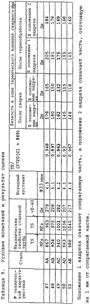 Результаты приведены в таблице 9. В этой таблице под заголовком “После сварки” в столбце “Вязкость в зоне термического влияния сварного шва” отображена вязкость в зоне термического влияния сварного шва стальной трубы, подвергшейся развальцовке трубы без нагревания сварного шва, а под заголовком “После термообработки” отображена вязкость в зоне термического влияния сварного шва стальной трубы, подвергшейся развальцовке трубы после нагревания сварного шва посредством индукционного нагрева. В любой из сталей АА-АЕ предел прочности при растяжении основной стали составляет не менее 900 МПа; что касается вязкости основной стали, то характеризующая ее энергия, поглощаемая при испытании на удар по Шарпи при температуре -40°С, составляет не менее 200 Дж, а что касается вязкости в зоне термического влияния сварного шва, то характеризующая ее энергия, поглощаемая при испытании на удар по Шарпи при температуре -30°С, составляет не менее 100 Дж. Таким образом, получены высокопрочные стальные трубы с превосходной вязкостью при низких температурах в основной стали и превосходной вязкостью в зоне термического влияния сварного шва.