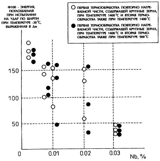 В результате этих исследований авторы данного изобретения, во-первых, выяснили, что снижение вязкости при низких температурах при сварке с наложением двухслойного сварного шва было вызвано карбонитридом ниобия, а в дальнейшем были получены доказательства того, что количество Nb оказывается исключительно значимым при попытках избежать упомянутого снижения. Во-вторых, в связи с основной сталью оказалось, что иногда при некоторых условиях испытаний наблюдалась малая энергия, поглощаемая при испытании на удар по Шарпи, и авторы данного изобретения выяснили, что эта малая энергия, поглощаемая при испытании на удар по Шарпи, была вызвана, в частности, существованием крупных зерен, и обнаружили, что уменьшение количества Nb проявило себя исключительно эффективной контрмерой.