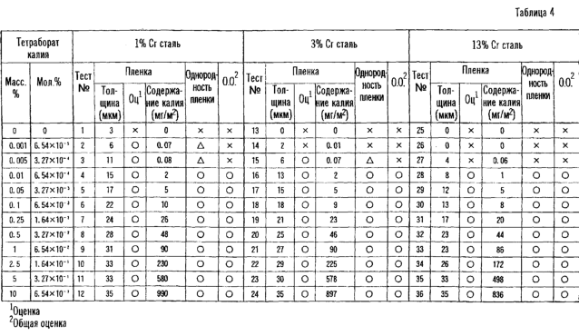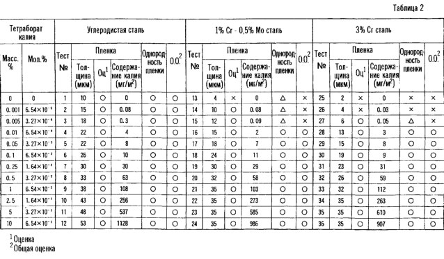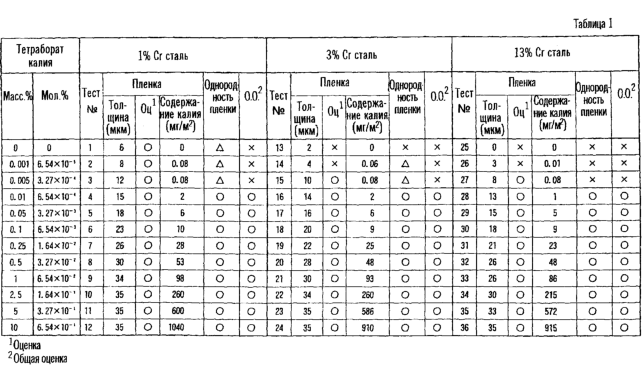 На основании таких открытий авторы настоящего изобретения продолжили научные исследования и разработки и в дальнейшем установили, что такое влияние соединения калия и, в частности, тетрабората калия обычно наблюдается в химических конверсионных пленках, образованных при хроматной обработке, оксалатной обработке и тому подобных, и осуществили данное изобретение.