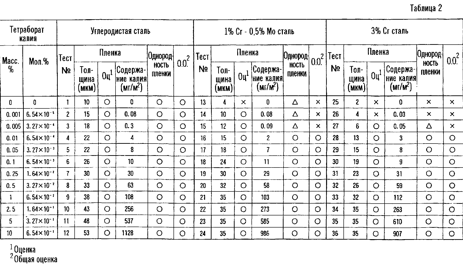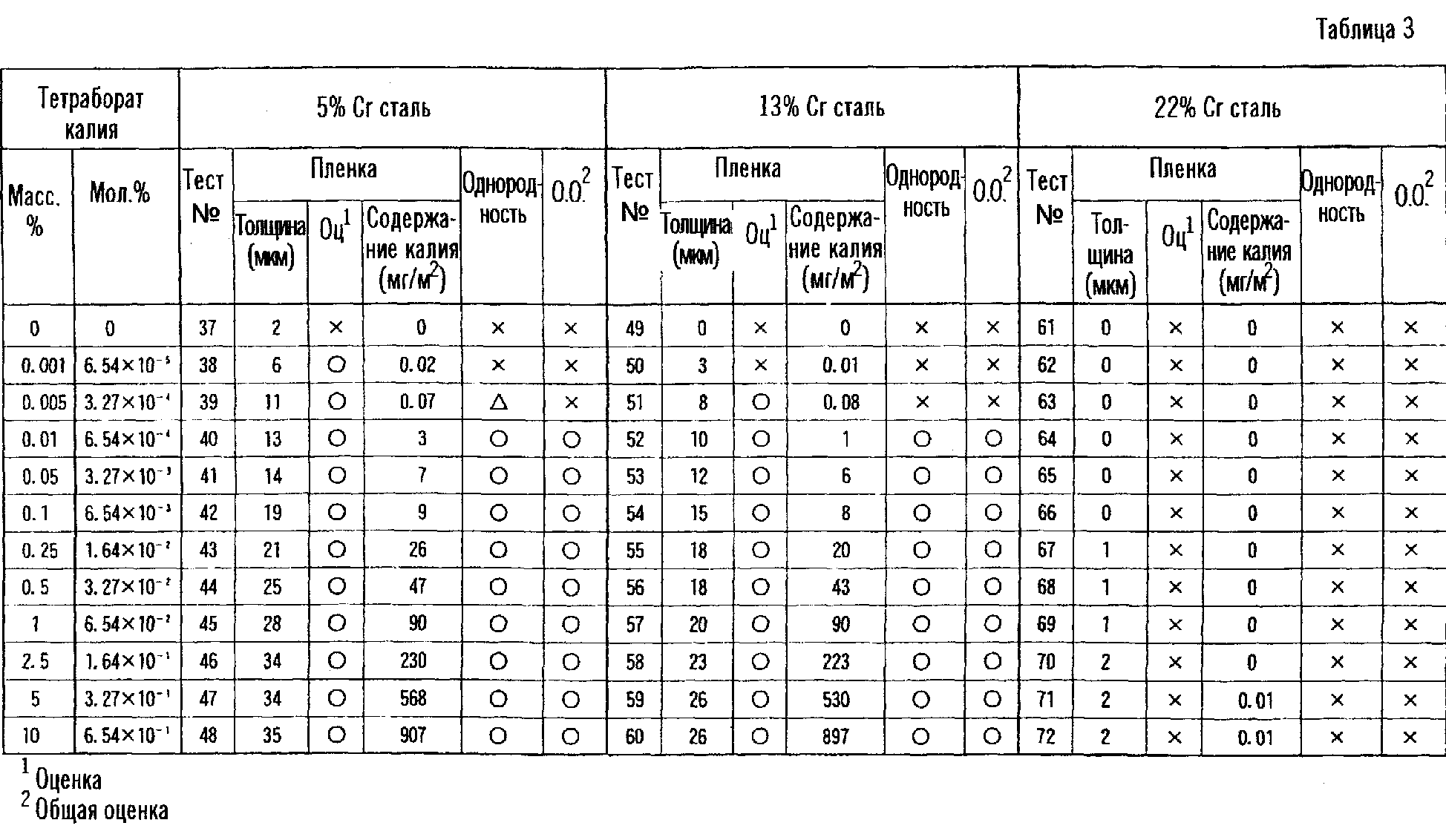 В таблицах толщину пленки оценивали следующим образом: × (неприемлемая) указывает на толщину пленки менее 5 микрометров, а (хорошая) указывает на толщину пленки, составляющую по меньшей мере 5 микрометров. Равномерность пленки оценивали с помощью результата исследования отношения (%) площадей непокрытой поверхности (обнаженной поверхности металла), наблюдающейся в пленке, образованной на тестируемых образцах, и общей поверхности. (хорошая) указывает на отношение площадей не более 5%, (обычная) указывает на отношение площадей более 5%, но не более 20%, и × (неприемлемая) указывает на отношение площадей, превышающее 20%. Для общей оценки, (приемлемая) указывает, что результаты испытания были как для толщины пленки, так и для равномерности пленки, и × (неприемлемая) указывает, что результаты испытаний были или × для одного или обоих показателей, т.е. толщины пленки и равномерности пленки.