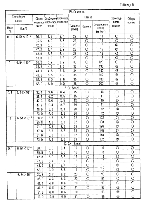 В таблице однородность пленки оценивали по отношению площадей непокрытой поверхности (обнаженной поверхности металла) и общей поверхности следующим образом: (превосходная) указывает на отношение площадей не более 1%, (хорошая) указывает на отношение площадей, превышающее 1%, но не более 5%. Для общей оценки (приемлемая) указывает, что результаты испытаний были или для однородности пленки. Результаты испытаний представлены в таблице 5.