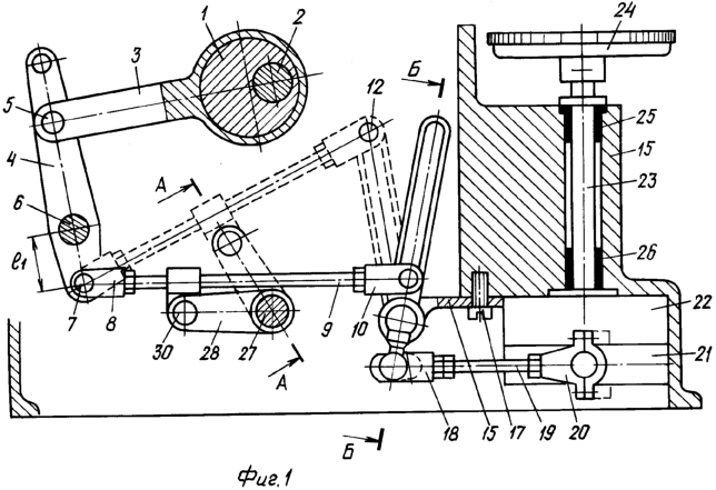 На фиг.1 изображен механизм перемещения материала с устройством изменения длины стежка, вертикальный разрез по оси игловодителя (расположение звеньев соответствует максимальной и минимальной величине стежка);