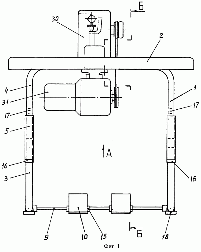 Станина снабжена опорами 18, которые выполнены в виде пружинных скоб 19 (фиг.3), плотно охватывающих нижние -образные трубчатые элементы 3, на которых установлены резиновые башмаки 20. Опоры могут быть выполнены в виде квадратных резиновых втулок 20 (фиг.6), плотно охватывающих нижние -образные трубчатые элементы, при этом отверстия квадратных резиновых втулок выполнены со смещением “е” по отношению к центру квадратов.