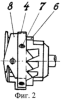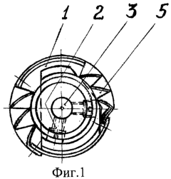 Челнок 1, внутри которого находится сетка с челночным колпачком, закреплен двумя винтами 2 на челночном валу 3. Полоса 4 с изогнутыми лопатками 5 крепится на наружной поверхности корпуса 6 теми же винтами 7, которыми прикреплено крылышко 8. При этом лопатки могут быть выполнены как одно целое с полосой или с крылышком или припаяны к ним. Полоса и лопатки имеют малую массу, так как выполнены из тонкой жести или пластмассы, почти уравновешены и поэтому не требуется дополнительная балансировка челнока с вентилятором. Лопатки расположены над ступицей около двух вырезов в корпусе челнока. Осевой наклон лопаток может быть правым или левым в зависимости от направления вращения челнока и требуемого направления воздушного потока. Радиальный наклон лопаток определяет соотношение радиальной и осевой составляющих создаваемого вентилятором воздушного потока.