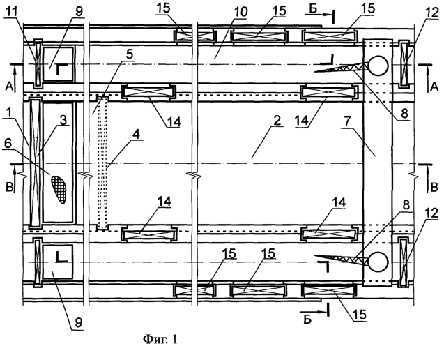 фиг.2 – продольный разрез А-А на фиг.1, вдоль продольной оси обводной галереи;