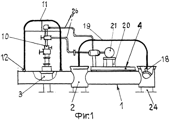 Стыковка монтажной рамы 4 с основанием 1 платформы производится дистанционно со вспомогательного судна, а водолаз только корректирует посредством средств связи действия оператора грузоподъемного устройства и производит соединение узлов монтажными болтами 25 через отверстия 15 и 17, а также технологического оборудования 21 с фонтанной арматурой 10 и трубопроводами 26. Затем технологическое оборудование накрывают защитной решеткой 19.