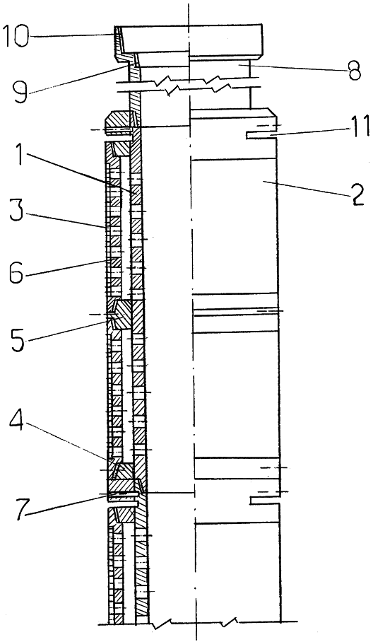 В зависимости от длины фильтр может состоять из нескольких перфорированных каркасов 1 с фильтровыми рубашками 2.