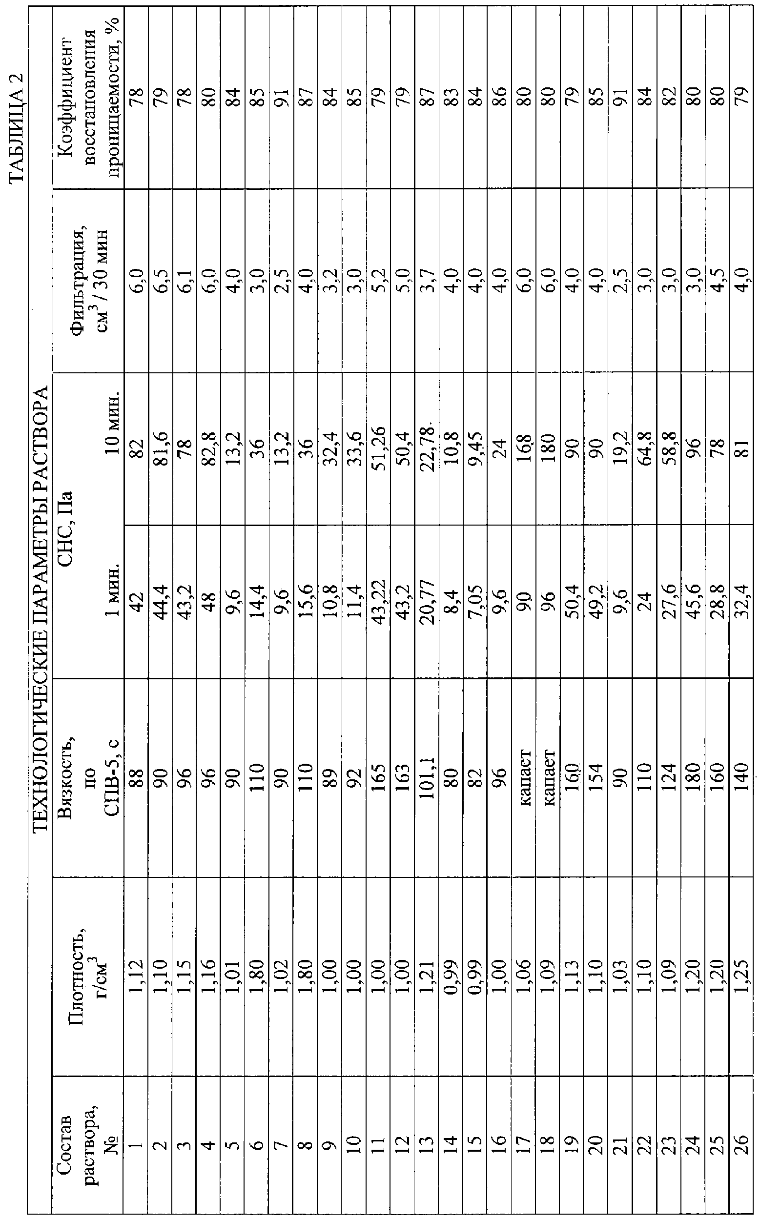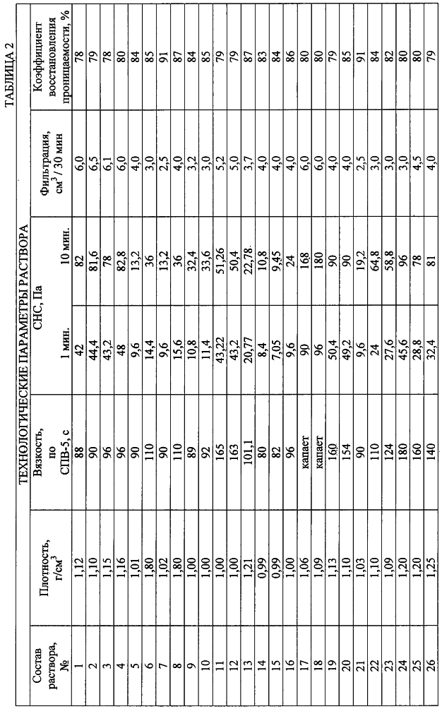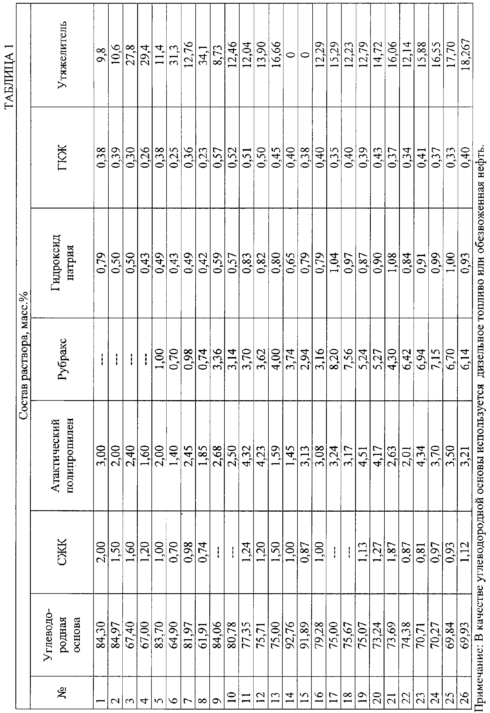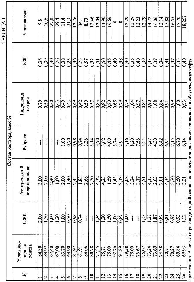 Углеводородной основой является дизельное топливо или обезвоженная нефть. СЖК – синтетическая жирная кислота – структурообразователь и стабилизатор мыл синтетических жирных кислот выпускается согласно ГОСТ 23239-89. Гидроксид натрия (NaOH производится по ГОСТ 2263-79) представляет собой бесцветную непрозрачную кристаллическую массу, хорошо растворимую в воде. ГКЖ 10 (11) – кремнийорганическая жидкость – представляет собой водно-спиртовой раствор этил (метил) силиконата натрия хорошо растворяется в воде, не растворяется в маслах. Свойства жидкости нормируются ТУ 6-02-696-76. Рубракс это высокоокисленный битум с температурой плавления 115°С. Выпускается по ГОСТ 781-78. Растворяется в среде углеводородов, зольность меньше 0,8%, содержание влаги – следы, температура размягчения по методике “кольца и шара”- 125-135°С. Область применения – смягчитель в резиновых смесях в шинной промышленности. Утяжелитель – барит (BaSO4 изготавливается согласно ГОСТ 4682-84), тонкозернистый порошок серого цвета не растворяется в воде и углеводородных жидкостях, применяется для изменения плотности бурового раствора. Приготовление жидкости для глушения нефтяных, газовых и газоконденсатных скважин на углеводородной основе осуществляется следующим образом. В небольшом количестве дизельного топлива, разогретого до температуры 60-70°С, растворяют СЖК, отдельно растворяют атактический полипропилен также в небольшом количестве углеводородной основы с температурой 60-70°С, растворяют в дизельном топливе рубракс при температуре 20°С, рубракс растворяется за 12 часов (при нагревании и перемешивании растворение происходит значительно быстрее). После этого растворенные ингредиенты раствора вводят в оставшуюся часть углеводородной основы, которая помещена в перемешивающее устройство, перемешивают 5-10 мин. Затем в смесь добавляют гидроксид натрия – водный раствор каустической соды, перемешивая при этом всю композицию. В процессе 10-минутного перемешивания СЖК и рубракс вступают в реакцию с гидроксидом натрия, образуя мыла. Далее в раствор вводят ГКЖ и атактический полипропилен. После этого в раствор добавляют утяжелитель. Весь раствор перемешивают еще 10 минут. Общее время приготовления составляет 50 минут. Готовую жидкость на углеводородной основе оставляют на несколько часов в покое. После производят замер технологических параметров. Для температур до 120-150°С структуробразователем является СЖК и атактический полипропилен, а для температур от 150 до 220 С структуробразователем является рубракс и ГКЖ. Пример 1 В 150 мл (31,39%) дизельного топлива, разогретого до температуры 60-70°С, раздельно, в равных пропорциях, растворяют 4г (1.00%) СЖК, 8 г (2.00%) атактического полипропилена и 4 г (1.0%) рубракса. Затем растворенные ингредиенты смешивают с 250 мл (52,31%) дизельного топлива с температурой 20°С и все перемешивают 5-10 мин. После этого в смесь добавляют 2,8 мл (0.49%) гидроксида натрия – 50% водного раствора каустической соды для омыления СЖК и рубракса, интенсивно перемешивая в течение 10 минут всю композицию, добавляют 1,3 мл (0.38%) ГКЖ и перемешивают. В полученную смесь вводят 45,5 г (11.4%) барита, постоянно перемешивая. Пример 2 В 150 мл (29,01%) дизельного топлива, разогретого до температуры 60-70°С, раздельно, в равных пропорциях, растворяют 4 г (1,24%) СЖК, 14 г (4.32%) атактического полипропилена и 12 г (3,70%) рубракса. Затем р