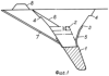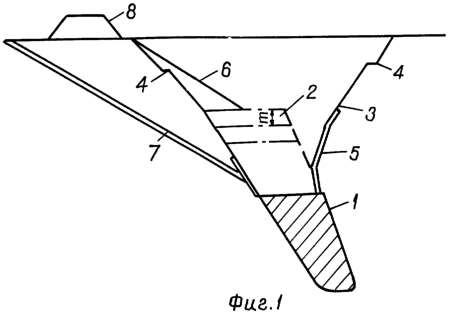 Фиг.1 – Отработка рудного тела карьером и переходом к отработке запасов ниже дна карьера: 1 – рудное тело; 2 – слои (уступы); 3 – борт карьера; 4 – берма очистки; 5 – крепление откоса; 6 – доставка руды и вскрыши на поверхность; 7 – наклонный ствол; 8 – отвал.