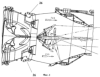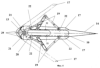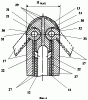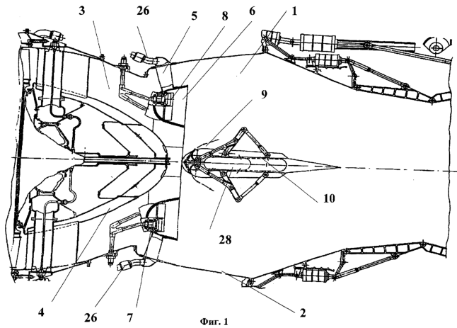 На чертежах также показаны боковые отверстия 28 центрального тела 9, связанные с внутренней полостью 23 пустотелых пилонов 16, каналы 29 подвода охлаждающего воздуха к сквозным отверстиям 21, зазоры 30, образованные круглой цилиндрической поверхностью 31 входной части 13 центрального тела 9 и цилиндрической поверхностью 32 кулачкового профиля плоских панелей 17, и реактивное сопло 34.