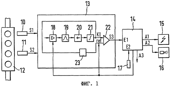 Блок 13 обработки сигналов может быть выполнен в виде отдельной схемы либо может входить в состав микрокомпьютера. Блок 13 обработки сигналов может быть встроен, например, в блок управления ДВС. Микрокомпьютер 14, осуществляющий дальнейшую обработку сигналов S3, поступающих от блока 13 обработки сигналов, может представлять собой, например, микропроцессор блока управления. Микрокомпьютер 14 управляет устройствами 15 системы зажигания и/или устройствами 16 системы впрыскивания топлива в зависимости от сигнала S3, позволяющего определить наличие или отсутствие детонации, и регулирует таким путем протекание процесса горения в отдельных цилиндрах ДВС.