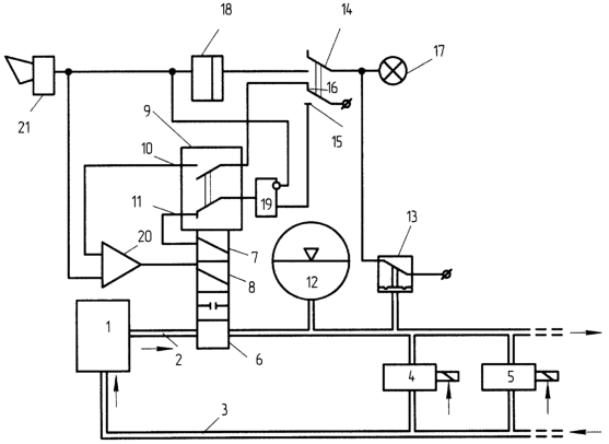Датчик давления 13, когда его контакт замкнут (давление недостаточно для работы потребителей), подключен к сигнализации 17 и через переключатель 14 к элементу задержки времени 18.