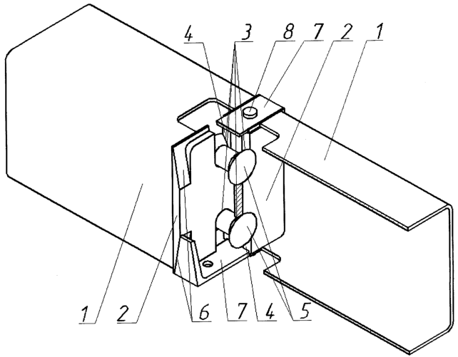 Первоначально соединяемые элементы 1 сближаются до соприкосновения соединительных плит 2, что дает возможность через прорези 4 в соединительных плитах 2 установить несущие элементы 3 в отверстия 3 соединительных плит 2. После чего соединяемые элементы 1 раздвигаются насколько им позволяют несущие элементы 5, и в образовавшийся между скосов 6 соединительных плит 2 зазор устанавливаются расклины 7, которые затем болтовыми соединениями 8 стягиваются до создания необходимого предварительного напряжения в узле соединительном, что позволяет жестко соединить соединяемые элементы.