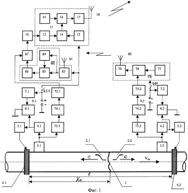 Устройство содержит место разрыва или повреждения трубопровода 1, две образовавшиеся волны пониженного давления 2.1, 2.2, датчики давления 3.1, 3.2, усилители-преобразователи 4.1, 4.2, управляющие блоки 5.1, 5.2 клапанов, клапаны-отсекатели 6.1, 6.2, ключи 8.1, 8.2, обмотки 7.1, 7.2 и контакты 9.1.1, 9.2.1 реле, источники питания 9.1, 9.2, вычислительный блок 10, передатчики 11, 76, формирователь кода 12, генератор 13 модулируемого кода, сумматор 14, генераторы 15, 77 высокой частоты, фазовые манипуляторы 16, 78, усилители 17, 79 мощности, передающие антенны 18, 80, усилители 73.1, 73.2, фильтры 74.1, 74.2, аналого-цифровые преобразователи 75.1, 75.2, приемную антенну 81, приемник 82, усилитель 83 высокой частоты, линию задержки 84, перемножитель 85, фильтр 86 нижних частот и коррелятор 87. Датчики 3.1, 3.2 давления устанавливаются в начале и конце контролируемого участка трубопровода. К выходу датчика 3.1 (3.2) давления последовательно подключены усилитель-преобразователь 4.1 (4.2), управляющий блок 5.1 (5.2) клапана и клапан-отсекатель 6.1 (6.2). К источнику питания 9.1 (9.2) последовательно подключены обмотка 7.1 (7.2) реле и ключ 8.1 (8.2), управляющий вход которого соединен с выходом усилителя-преобразователя 4.1 (4.2). К выходу датчика 3.1 (3.2) последовательно подключены усилитель 73.1 (73.2), фильтр 74.1 (74.2) и аналого-цифровой преобразователь 75.1 (75.2). К выходу генератора 77 высокой частоты последовательно подключены фазовый манипулятор 78, второй вход которого соединен с выходом аналого-цифрового преобразователя 75.2, усилитель мощности 79 и передающая антенна 80. К выходу приемной антенны 81 последовательно подключены усилитель 83 высокой частоты, линия задержки 84, перемножитель 85, второй вход которого соединен с выходом усилителя 83 высокой частоты, фильтр 86 нижних частот, коррелятор 87, второй вход которого соединен с выходом аналого-цифрового преобразователя 75.1, вычислительный блок 10, формирователь кода 12, сумматор 14, второй вход которого соединен с выходом генератора 13 модулирующего кода, фазовый манипулятор 16, второй вход которого соединен с выходом генератора 15 высокой частоты, усилитель 17 мощности и передающая антенна 18. Питание передатчиков 11, 76 и приемника 82 обеспечивается через контакты 9.1.1 и 9.2.1.