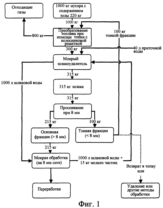 В соответствии с блок-схемами 1000 кг мусора с содержанием золы 220 кг загружают на колосниковую решетку и сжигают при этом таким образом, что уже 25-75% образующихся остатков от сжигания превращаются в полностью спеченный шлак. Во время этого процесса сжигания образуются 800 кг отходящих газов и 300 кг остатков от сжигания. Последние попадают в мокрый шлакоудалитель, из которого вследствие смачивания выносятся 315 кг остатков от сжигания или шлака. Эти остатки от сжигания подвергают механическому разделению, в данном случае просеиванию при 8 мм. При этом 215 кг остатков от сжигания или шлака отделяют в виде основной фракции крупностью более 8 мм, с одной стороны, и порядка 100 кг тонкой и сверхтонкой фракций крупностью менее 8 мм. Шлак крупностью более 8 мм, включающий в себя крупную фракцию и отсев, подвергают мокрой обработке, а именно из мокрого шлакоудалителя отбирают 1000 л воды для того, чтобы промыть этот шлак и смыть при этом порядка 15 кг мелких частиц крупностью менее 8 мм. Эту промывку целесообразно проводить на сите с просевом 8 мм и менее. Шлаковую воду в сочетании с этими мелкими и сверхмелкими частицами возвращают в мокрый шлакоудалитель. Промытый шлак выгружают и используют для переработки, например, в дорожном строительстве. Отделенную при просеивании тонкую фракцию массой около 100 кг обычным образом снова загружают на колосниковую решетку для достижения дальнейшего спекания. Можно также направлять эту долю на обработку другими способами. 40 л приточной или свежей воды подают, чтобы компенсировать потери воды в мокром шлакоудалителе, возникающие из-за того, что остатки от сжигания при выносе из мокрого шлакоудалителя, само собой, уносят с собой жидкость.