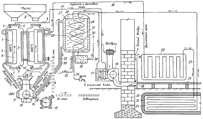 Автономная система отопления содержит поочередно включающиеся и разгружающиеся автоклавные газогенераторы 1 с встроенными под кожухом 2 теплоэлектронагревателями 3, загрузочными и разгрузочными люками 4, 5 с герметичными крышками 6 и 7 и с центральным стволом 8, предназначенные для пиролиза бытовых отходов, горючего мусора и материалов, накапливаемых в бункерах 9, а также двигатель внутреннего сгорания 10 с водяной рубашкой охлаждения 11 и водяным насосом (на схеме не показан), с коллектором 12 выхлопных газов, используемых в качестве теплоносителей, и с дозатором 13 жидкого и газообразного топлива, связанный через муфту 14 с электрогенератором 15 для выработки электрического тока для теплоэлектронагревателей 3 и освещения помещений. Помещения дома оснащены системой приточной вентиляции для обогрева теплым воздухом, состоящей из воздухозаборника вентилятора 16, коробов с встроенным теплообменником 17 и вентиляционными окнами 18 и щелями 19, выходящими в подвал и в боковые стены, а также радиаторами батарей 20 отопления. Под полом 21 в грунтовом основании дома устроен тепловой аккумулятор 22, выполненный в виде закрытого в изоляторе 23 теплоемкого материала 24, в качестве которого используется булыжник, щебень и песок, скрывающего трубопровод 25 с выхлопными газами в качестве теплоносителя. Система горячего водоснабжения (см. чертеж) состоит из водяного бака 26 с нагреваемой для санитарно-технических нужд водой 27, выполненного с двойными стенками, образующими емкость 28 для охлаждения воды из водяной рубашки охлаждения 11 двигателя 10, и с встроенным внутри бойлером 29, выполненным в виде двух змеевиков 30 и 31 с горячими теплоносителями, в качестве которых использованы соответственно выхлопные газы, поступающие из теплового аккумулятора 22, и дымовые и горючие газы, поступающие из теплообменника 17 системы вентиляции. На выходе из водяного бака 26 змеевик 30 связан с катализатором 32 вредных газов из отработанных выхлопных газов, выбрасываемых после катализатора в атмосферу, а змеевик 31 с сконденсированным из горючих и дымовых газов жидким топливом связан через трубопровод 33 с дозатором 13 двигателя 10. Водяной бак 26 с нагретой водой связан через трубопровод 34 с санитарно-техническими устройствами. Емкость 28 водяного бака 26 через напорный 35 и подводящий трубопровод 36 связана с водяной рубашкой охлаждения 11 двигателя 10. Коллекторы 12 выхлопных газов двигателя 10 связаны с центральным стволом 8 газогенераторов 1 через трубопровод 37. Ствол 8 газогенератора 1 связан с теплообменником 17 системы вентиляции через трубопровод 41, а теплообменник 17 связан со змеевиком 31 трубопроводом 39. Полость 40 газогенератора 1, загруженная горючими материалами для пиролиза, соединена трубопроводом 38 с радиаторами батарей 20, связанными на выходе с трубопроводом 25 в тепловом аккумуляторе 22.