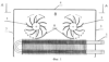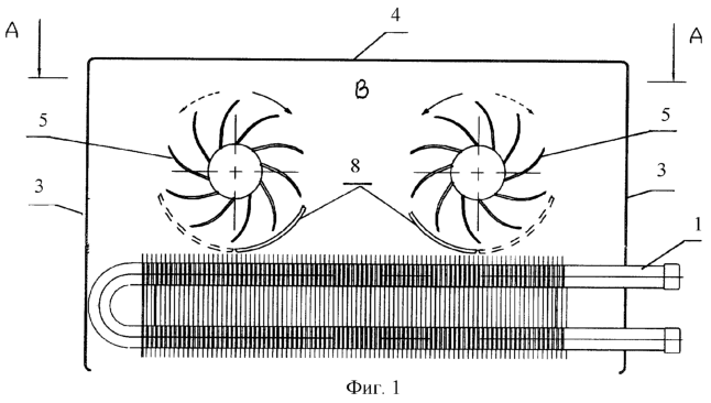 Конвектор включает нагревательный элемент 1 (оребренные трубы), заключенный в защитный кожух. Кожух состоит из лицевой панели 2, боковых стенок 3 и верхней панели 4 (крышки), выполненных из листового материала. Лицевая панель 2 и верхняя панель 4 могут быть выполнены как единое целое. В кожухе над нагревательным элементом установлены два лопастных колеса 5. Оси 6 лопастных колес 5 закреплены на элементах кожуха. Лопастные колеса расположены на одном уровне, их оси 6 параллельны. Иными словами оси 6 лежат в одной горизонтальной плоскости и перпендикулярны продольной оси 7 кожуха. Лопасти колес спиралевидно изогнуты, при этом для обеспечения встречного вращения колес лопасти одного колеса изогнуты по часовой стрелке, другого – против часовой стрелки.