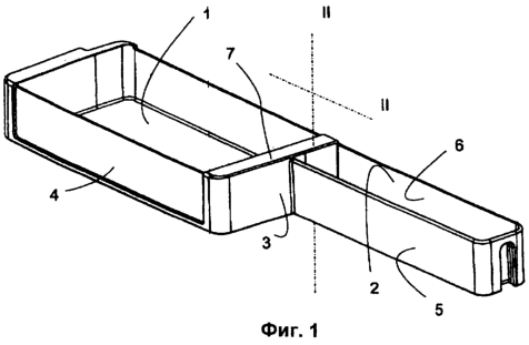 Изображенная на фиг.1 дверная полка 11 состоит из двух секций 1, 2, имеющих в основном форму открытой сверху коробки. Секция 1 имеет “полную” глубину, т.е. ее глубина достаточна для установки обычной 1,5-литровой или 2-литровой полиэтиленовой бутылки для напитков. Глубина второй секции 2 составляет меньше половины глубины первой секции, предпочтительно 30-40% этой глубины. Это позволяет установить в дверной полке полной глубины, расположенной под изображенной дверной полкой и находящейся на той же стороне двери большую бутылку для напитков, горлышко которой будет находиться на уровне секции 2, причем эта секция не будет касаться бутылки и нарушать ее устойчивое положение.