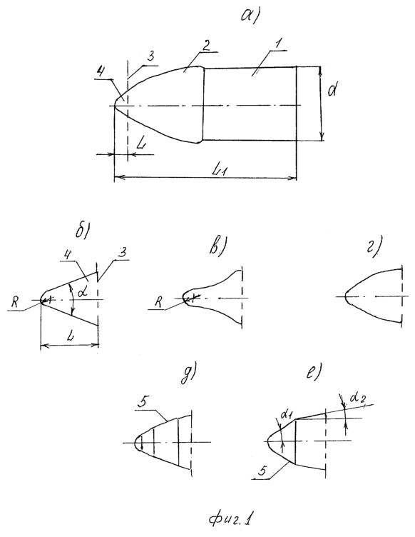 Пример 1. Твердосплавной сердечник имеет некоторую длину L1, состоит из хвостовой (калиберной) части 1 и головной части 2. Хвостовая часть имеет цилиндрическую форму, головная часть имеет нецилиндрическую (оживальную) форму. Головная часть оканчивается вершиной 4 с условно плоским торцом 3. Вершина 4 выполнена некой заостряющейся формы длиной L. Вершина имеет некоторый радиус R скругления. Величина этого радиуса более 1 мм нецелесообразна (доказано ниже). Заострение вершины может иметь несколько форм, например коническую форму (фиг.1б), криволинейную (фиг.1в), предпочтительно параболическую (фиг.1г) форму, либо вершина может быть образована некой ломаной линией 5, сопрягаемой с радиусом R и головной частью 2. В последнем случае предпочтительно образование вершины ломаной линией 5, состоящей из двух отрезков (фиг.1е), один из которых образует с осью сердечника угол 1, а другой – угол 2. Предпочтительно, чтобы указанные углы имели величины: 1=(45-60)°, 2=(20-40)°. Результаты достижения технического результата такой конструкцией сердечника приведены в табл.1. Они доказывают и сам результат и рекомендуемые величины длины L вершины, радиуса R ее скругления, угла конуса, углов 1 и 2 при формировании вершины ломаной линией из двух отрезков.