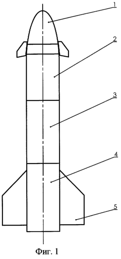 Управляемым снаряд состоит из головного отсека 1, двигателя 2, боевой части 3, аппаратурного отсека 4, крыльев 5.