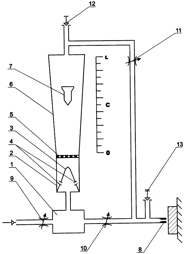 Перед измерениями производится настройка устройства при закрытом вентиле 12 и открытых входном 9 и дросселирующем 11 вентилях. При установке минимальной установочной детали и регулировки перепускного вентиля 10 и вентиля 13, производится настройка нижнего предела измерения, отмеченного на шкале делением «0», а при установке максимальной установочной детали соответственно верхнего предела «L». Далее устанавливают установочную деталь промежуточного размера, например, с размером по средине поля допуска «С». Неравномерность рабочей характеристики ротаметрических длиномеров вносит погрешность в измерение и поплавок 7, как правило, устанавливается с отклонением от реального промежуточного размера. Путем регулирования входного вентиля 9 поплавок устанавливают в положение, соответствующее промежуточному размеру. В результате этого нарушаются настройки длиномера на границах «0» и «L». Цикл настройки повторяется до соответствия показаний индикаторной трубки размерам всех установочных деталей.