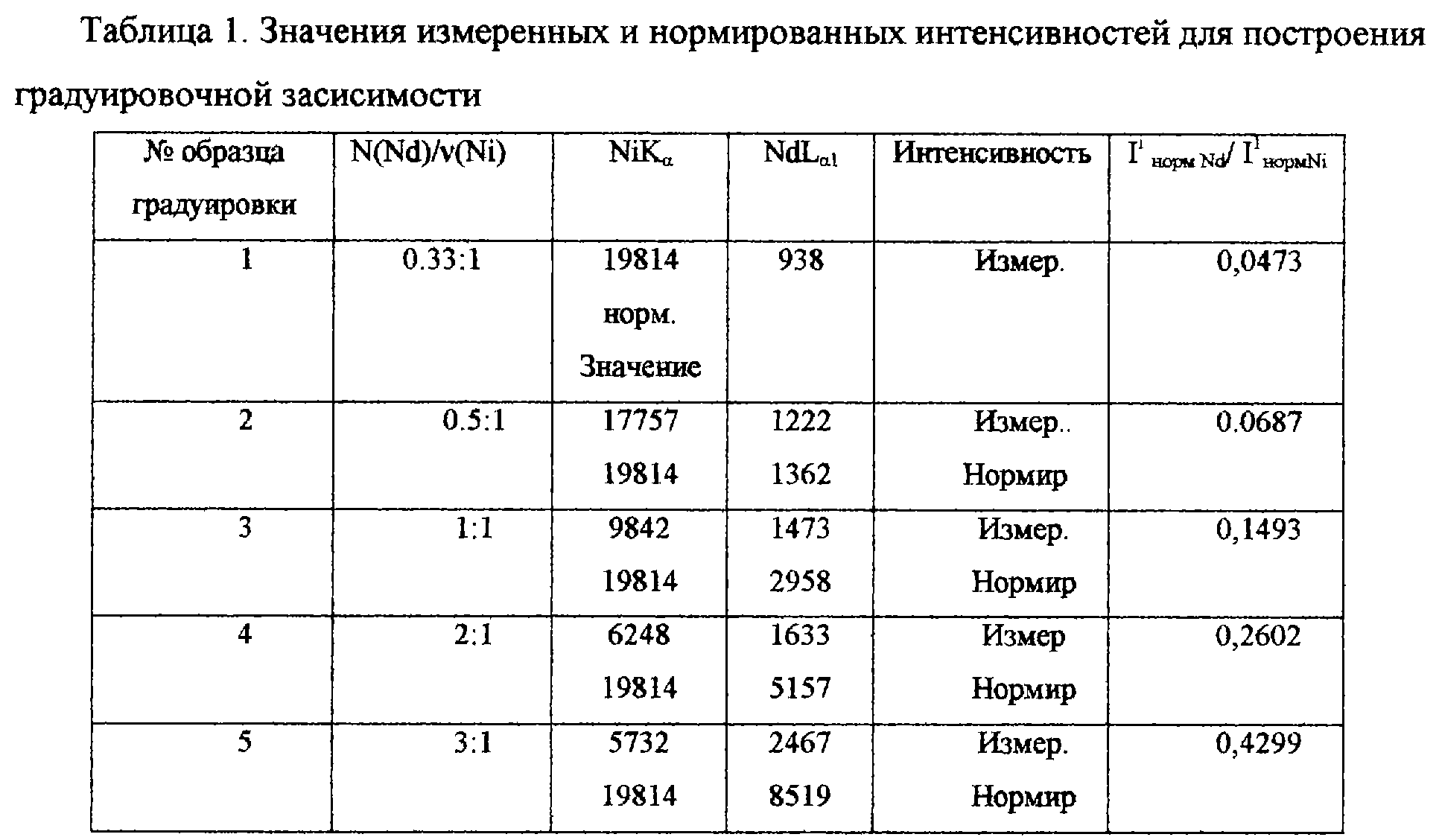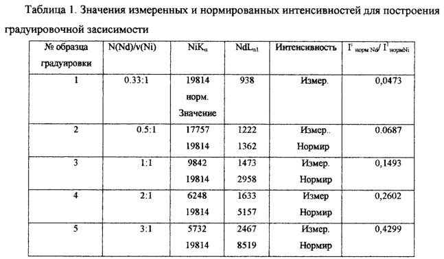 Полученные образцы-излучатели помещают в кюветное отделение РФ-спектрометра (рентгеновский кристаллдифракционный портативный спектрометр «Спектроскан» с молибденовым анодом и кристалл-анализатором LiF 200 производства ЗАО «Спектрон-Оптел», г. Санкт-Петербург) и проводят измерение интенсивности характеристического излучения Ni и Nd (табл.1).