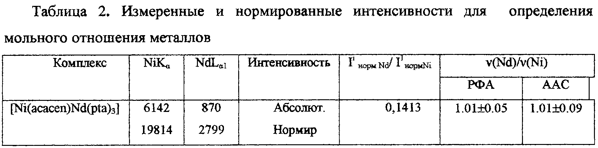 Способ определения мольного отношения металлов в гетеробиметаллических соединениях с использованием рентгенофлуоресцентного метода, включающий подготовку образцов сравнения, содержащих исследуемые металлы в известных мольных отношениях, измерение интенсивности флуоресценции на аналитической линии каждого из исследуемых металлов в образцах сравнения, построение градуировочной зависимости, измерение интенсивности флуоресценции каждого из металлов в исследуемом образце и определение мольного отношения металлов в комплексе по градуировочной зависимости, при этом для измерения интенсивности флуоресценции используют поглощающий слой образца, толщина которого не превышает 250 мкм, а градуировочная зависимость имеет следующий вид: