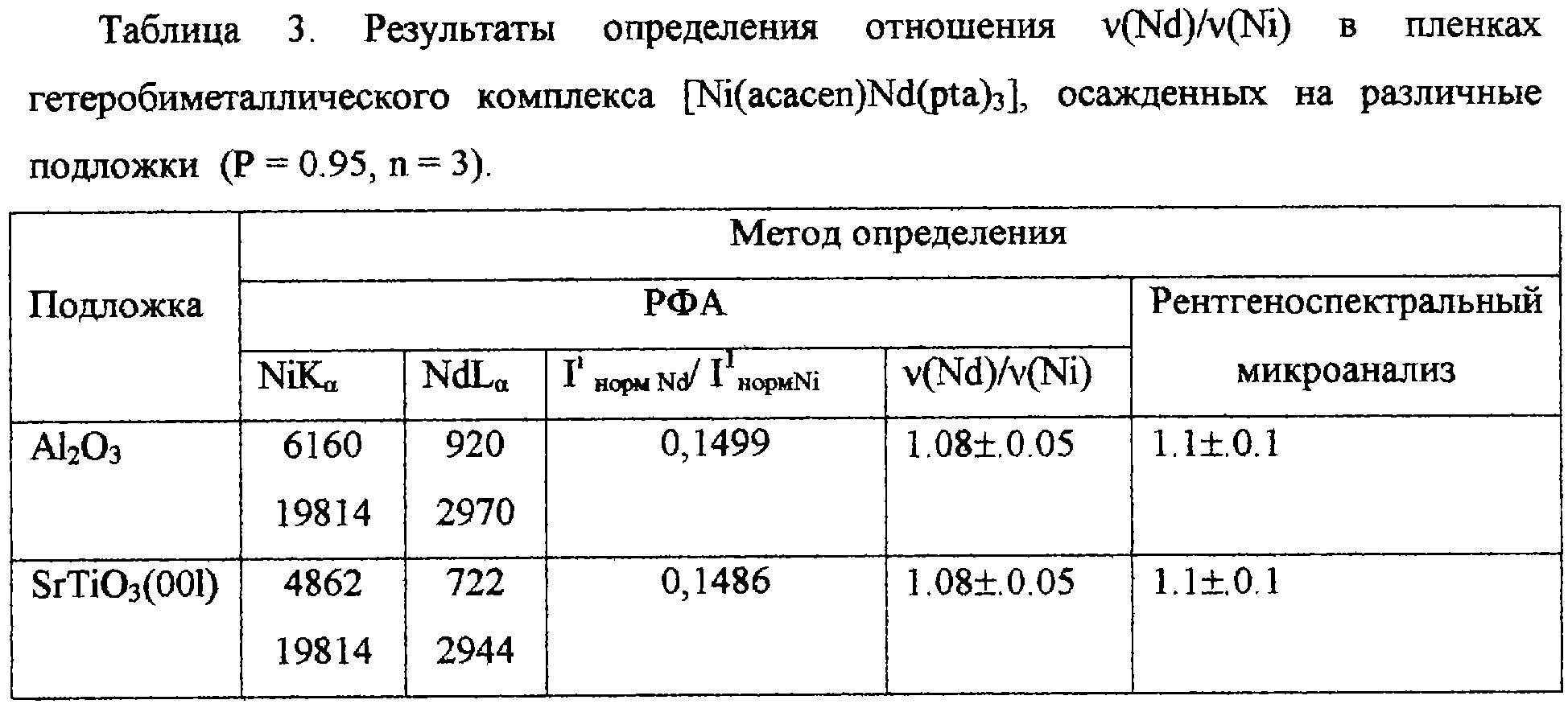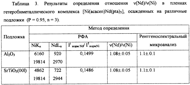 В табл. 3 приведены результаты определения отношения металлов в гетеробиметаллическом комплексе [Ni(acacen)Nd(pta)3], полученном в виде пленки, осажденной на подложку из Al2O3 (толщина пленки 20 мкм) и на подложку из SrTiO3(001) (толщина пленки 0,5 мкм). Правильность полученных результатов подтверждена методом рентгеноспектрального анализа.