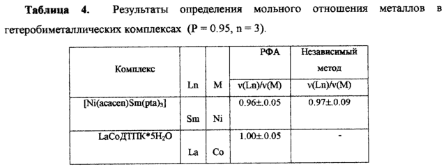 Авторы настоящего изобретения показали, что сложностей можно избежать, если определять не количественное содержание металлов в пробе, а их соотношение, которое в конечном счете и определяет свойства гетеробиметаллических комплексов. Ранее соотношение металлов в пробе рассчитывалось, исходя из их концентраций. В литературе не обнаружено методов, позволяющих определять непосредственно мольное отношение металлов в гетеробиметаллических соединениях.