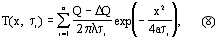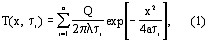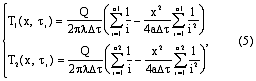 При нагреве исследуемого полуограниченного образца от линейного поверхностного источника импульсами заданной частоты и мощности при условии, что источник и термоприемник теплоизолированы от окружающей среды и все тепло уходит в исследуемое полубесконечное в тепловом отношении тело, температура в точке поверхности на расстоянии х от линии действия источника описывается следующим выражением: