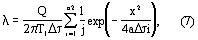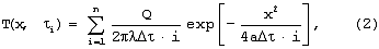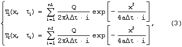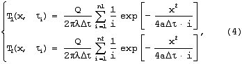 где i – ряд натуральных чисел, i= ·i;  – время между импульсами [с]; Q – мощность, выделяемая i-тым импульсом, [Вт/м]; – теплопроводность материала теплоизоляционной подложки, [Вт/м·К]; а – температуропроводность материала теплоизоляционной подложки, [м2/с]; х – расстояние от линейного источника тепла до точки контроля температуры в плоскости контакта подложки и исследуемого образца, [м]; n – число импульсов.