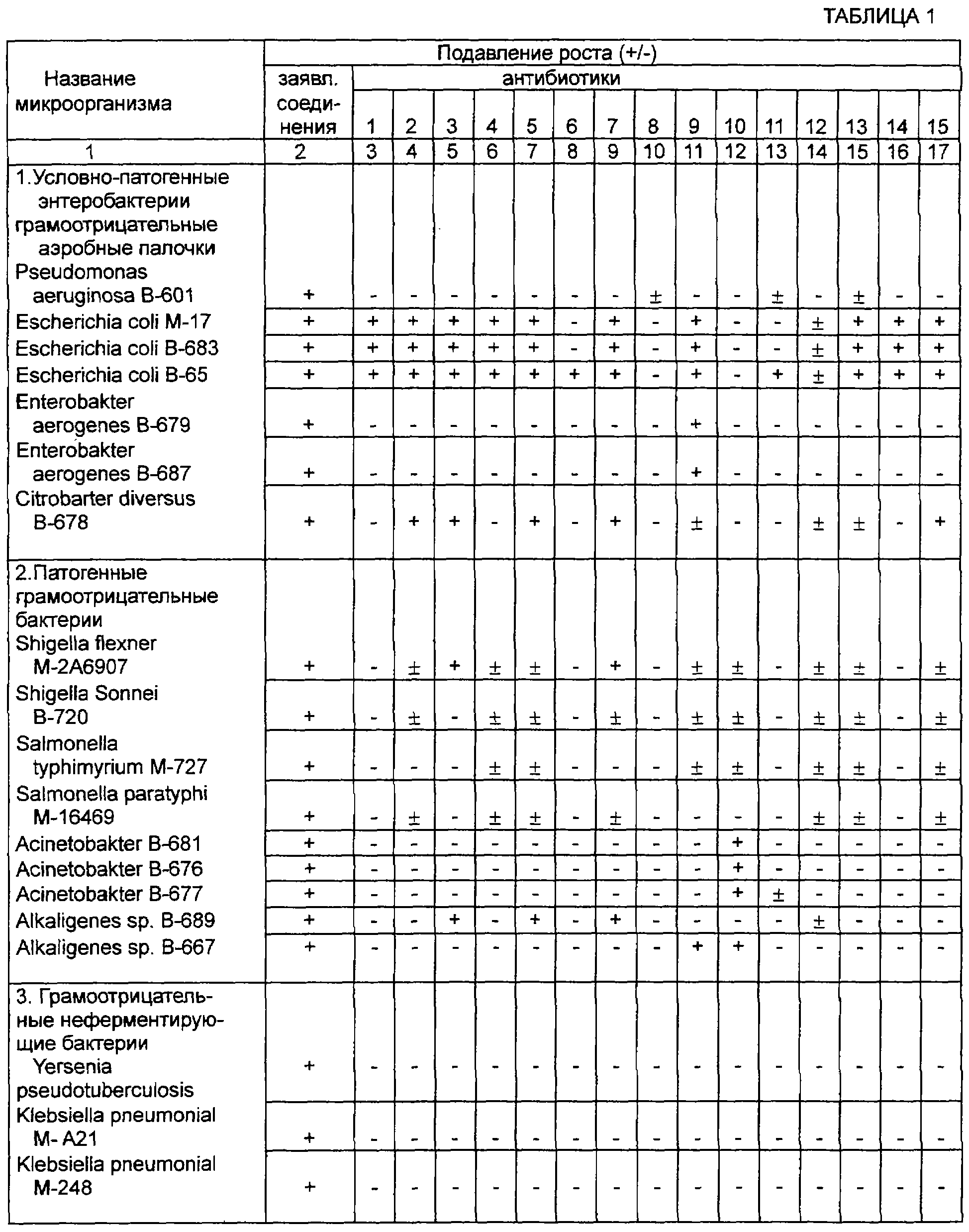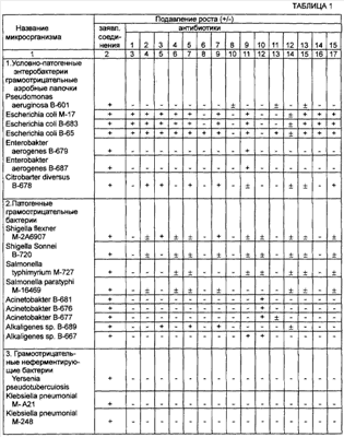 5·105 – 5·107 микр. тел/мл, и сравнительные результаты испытаний чувствительности к 15-ти антибиотикам: