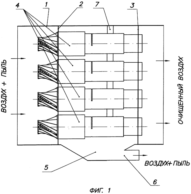 Целью настоящего изобретения является повышение эффективности очистки воздуха и снижение гидравлического сопротивления аппарата за счет повышения степени закрутки потока воздуха с одновременным обеспечением равномерного движения воздуха по сечению сепарационных патрубков, а также обеспечения своевременного отвода уловленных частиц из сепарационных патрубков.