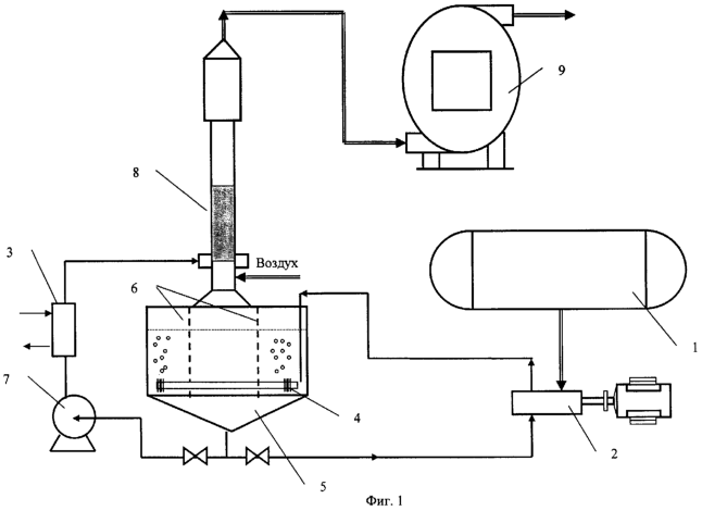 Схема процесса обезвреживания стерилизующего газа, удаляемого из стерилизатора, представленная на фиг.1, состоит из стерилизатора 1, жидкостно-кольцевого вакуумного насоса 2, холодильника 3, аэратора 4, бака 5 с орошающим раствором, перегородки 6, водяного насоса 7, пенно-струйного скруббера 8, каталитического реактора 9.