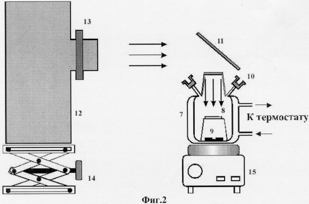 В реакторе (7) объемом 400 см3, термостатируемом при температуре, близкой к комнатной, помещают таблетку фотокатализатора (8). Перемешивание газа в реакторе осуществляют с помощью пропеллера (9), приводимого во вращение от магнитной мешалки (15). Освещение проводят ртутной лампой ДРШ-1000 (12), установленной на подъемном столике (14), свет от которой фильтруется интерференционным светофильтром (13) с максимумом пропускания при 365 нм и направляется на фотокатализатор (8) с помощью зеркала (11). Отбор проб газа из реактора (7) для анализа осуществляют через пробоотборник (10).