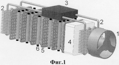 На Фиг.1 представлен пример возможной конструкции фотокаталитического очистителя воздуха, оборудованного дозатором пероксида водорода: 1 – вентилятор; 2 – теплообменники; 3 – насос; 4 – дозатор пероксида водорода; 5 – керамические носители с фотокатализатором; 6 – УФ лампы.